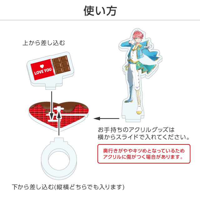 ①お手持ちのアクリルグッズの品質(厚みの誤差)により本商品へ装着できない場合がございます。予めご了承ください。